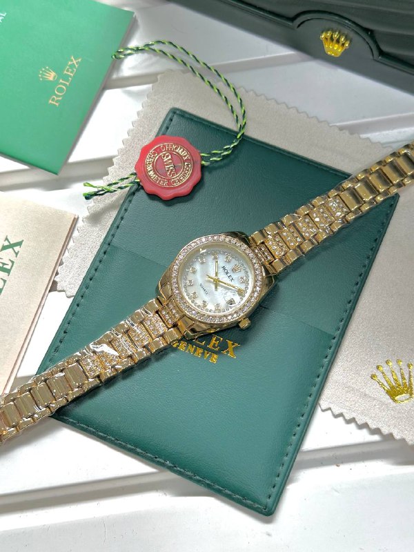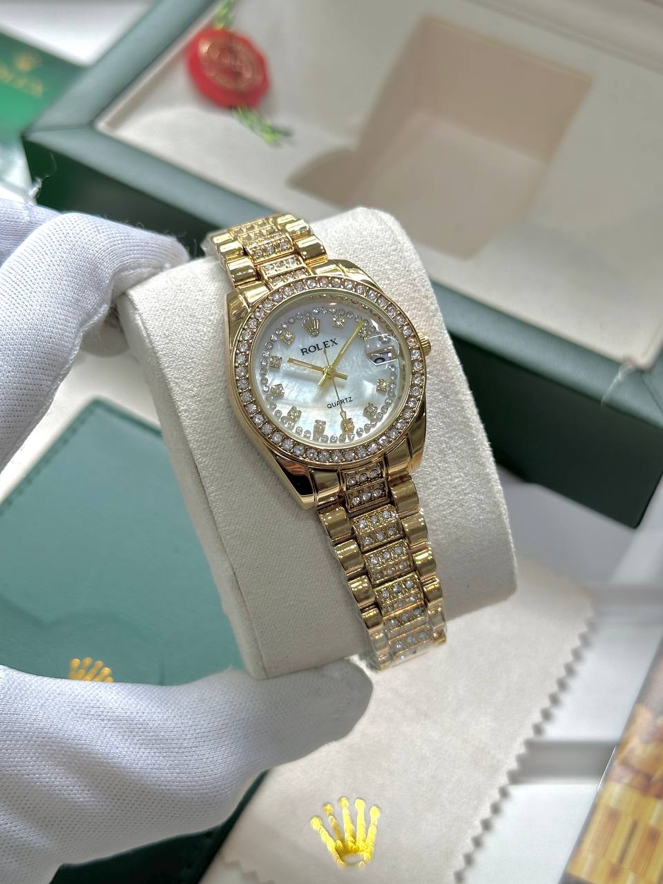 + Free Shipping*Rolex* For Women 5A Premium Quality *Date Just Oyster Collection* Dial Size – 28mm *LEADERS & VISIONARY PREMIUM COLLECTION* ❣️ – Working 12 Hour analog – Date indicator – White Textured Dial – Royal Diamond Indicators – 3 Link stainless steel gold diamond bracelet – Smooth movement machinery -Diamond studded Dial and belt